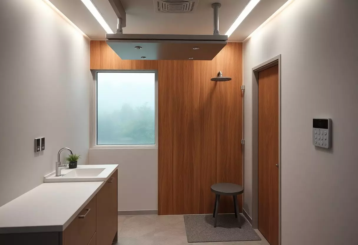 Privilégiez un élévateur vertical PMR ou un lève‑personne plafond de capacité 300-400 kg pour transferts, installez des barres d’appui à ~80-85 cm et des sièges de douche repliables; équipez le studio d’un plan de travail électrique réglable 70-85 cm et de sols antidérapants. Vous devez aussi intégrer des mitigeurs thermostatiques pour limiter le risque de brûlure (danger : risque de brûlure par eau chaude) et des surfaces contrastées pour repérage visuel.